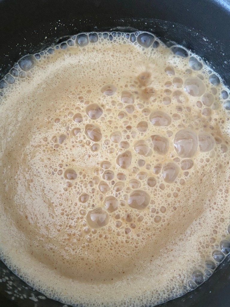 Step 2: put 1.5 cup coconut oil, 2-3 table spoons of honey, 1 table spoon vanilla extract, and 2 cups of peanut butter in a pot on the stove. Stir once in a while on low heat. When it starts to bubble like this and everything is mixed and melted, take off and turn off stove. Let it cool for 5 mins.