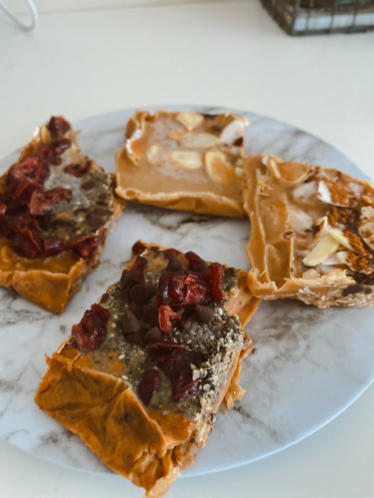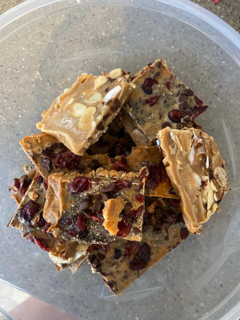 When you need a snack that’s a little more filling, these granola bars are a perfect and healthy option. I was at Target the other day and was debating about purchasing some granola bars because they would be a great snack for after working out or at work. Then, I began reading the ingredients on the back. There’s so many types and brands of granola bars that claim to be healthy, yet they literally have 20+ ingredients and so much added sugar and salt. Don’t be fooled. This prompted me to make my own with cleaner ingredients. This is a very simple recipe and you can make a lot of them at once and then store them in the fridge/freezer. I decided to make two types- Chocolate Coconut Almond and Cranberry Chia Chocolate. Also- I used all natural peanut butter that only has one ingredient (peanuts)- but feel free to use any type or brand of butter (almond, sunflower, etc.) Keep in mind you can also use different types of nuts/fruit/toppings! I just used the ones I liked best. These ended up being like the width of a Nature Valley granola bar for reference, SO if you want a thicker bar, use a smaller tray. It really comes down to preference.