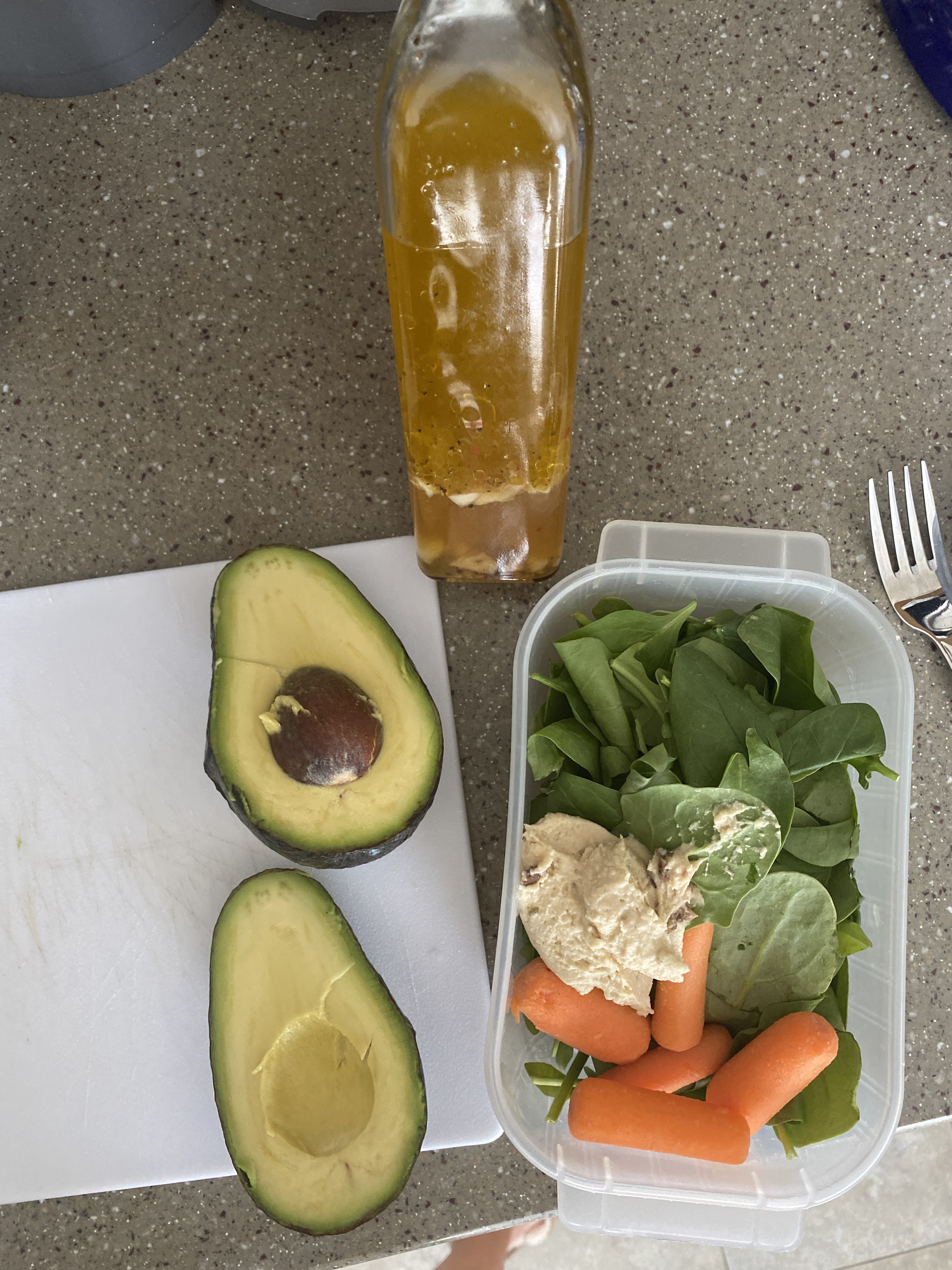 This was a salad I had on the go- some spinach on the bottom, carrots, spoonful of hummus, half of an avocado, and some of my homemade dressing. Simple, but filling and delicious.