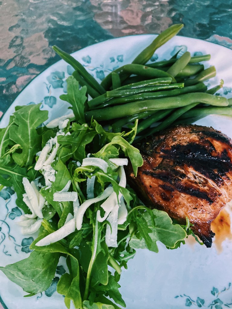 I grilled some chicken and then added some green beans and an arugula salad with some mozzarella on top. If you don’t have a grill, there are some great ways to cook chicken on the stove top or oven. Chicken is a great source of protein. I drizzled some homemade dressing on top.