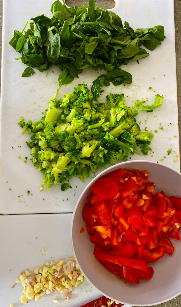 6 eggs, 1/3 cup of milk (whatever kind you prefer to use/I used almond), 1 red bell pepper, 1 cup brocoli, 1 cup spinach, 2 tablespoons garlic, 1 teaspoon of pepper, sprinkle of salt, sprinkle of nutritional yeast on top (optional- you could throw some cheddar or Parmesan on top if you’d like)