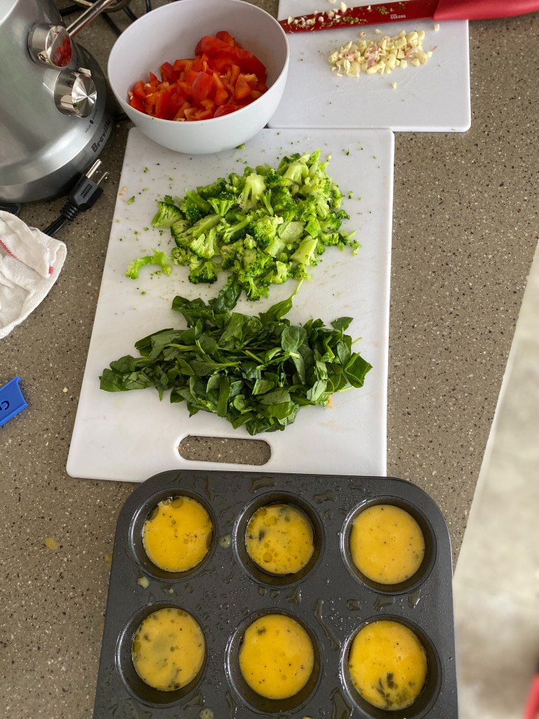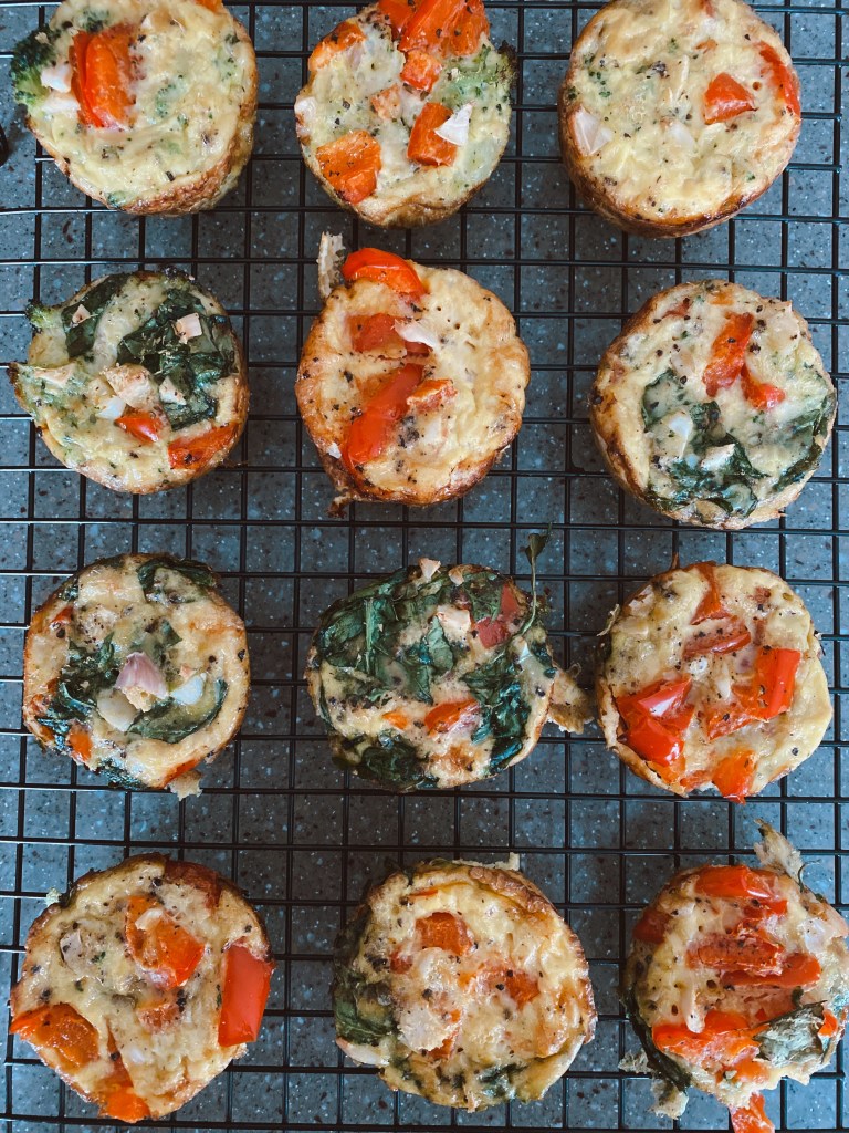I will be showing step by step on how to create this delicious and nutritious breakfast option. These are high in protein and have great nutrients from the vegetables. I personally used red bell peppers, spinach, and broccoli, but you can use whatever vegetables you like best! This recipe makes 12 frittata cups.