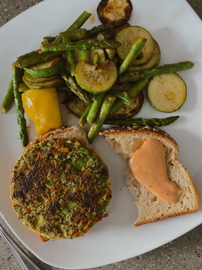 This is a great lunch/dinner option. I sautéed a bunch of veggies with olive oil, garlic, lemon, and a sprinkle of salt and pepper. I cooked a veggie burger on the stove top (you can healthier ones at most grocery stores like Aldi’s and Trader Joe’s) on a toasted piece of Food for Life bread with a little Sriracha on top.
