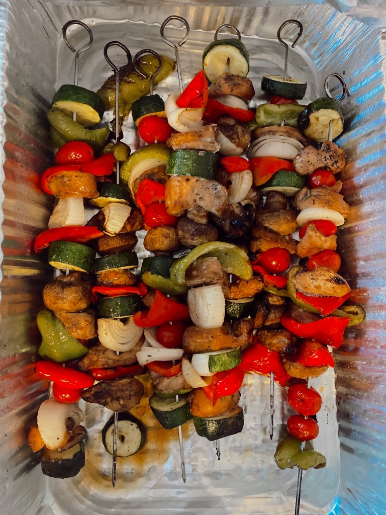 This is my favorite dinner for summer. I marinated some chicken and grabbed a bunch of vegetables that I like and then put it on screwers and grilled. I ended up using zucchini, bell peppers, mushrooms, grape tomatoes, and onions. Whatever vegetables you decide to use, make sure you use onions. The juice provides excellent flavor to the rest of the vegetables while they’re cooking.