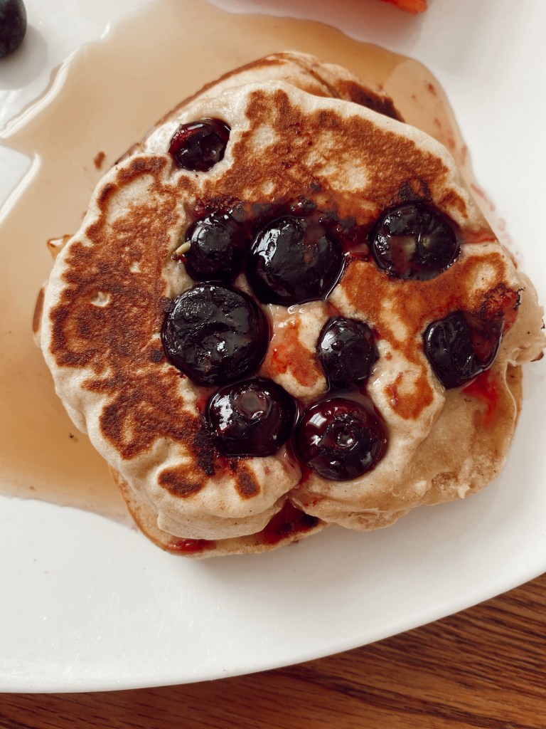 This was one of the breakfasts I had this week. Whole grain and dairy free pancakes (recipe coming soon) with blueberries and drizzled with a little bit of maple syrup.