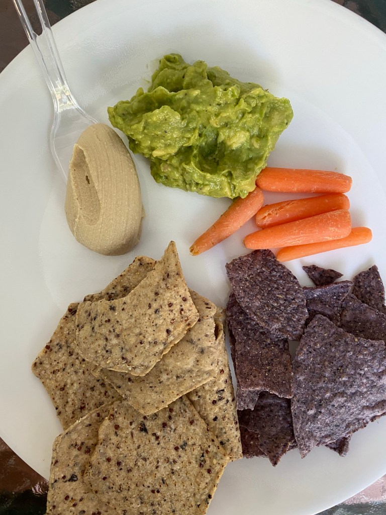 This was an afternoon snack I had the other day- two types of chips- bean and quinoa (on the left from Trader Joe’s) and blue corn chips (can find just about anywhere). I added some carrots and a spoonful of hummus. I made some guacamole with avocados, lime, garlic, tomato, and a sprinkle of salt and pepper.