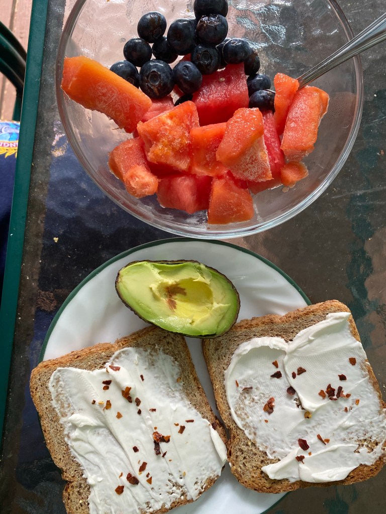 A delish breakfast. I started with a big bowl of fruit (papaya, watermelon, and blueberries. I toasted two pieces of Food For Life bread (seriously the healthiest bread around) with some vegan cream cheese, crushed red pepper, and some avocado.