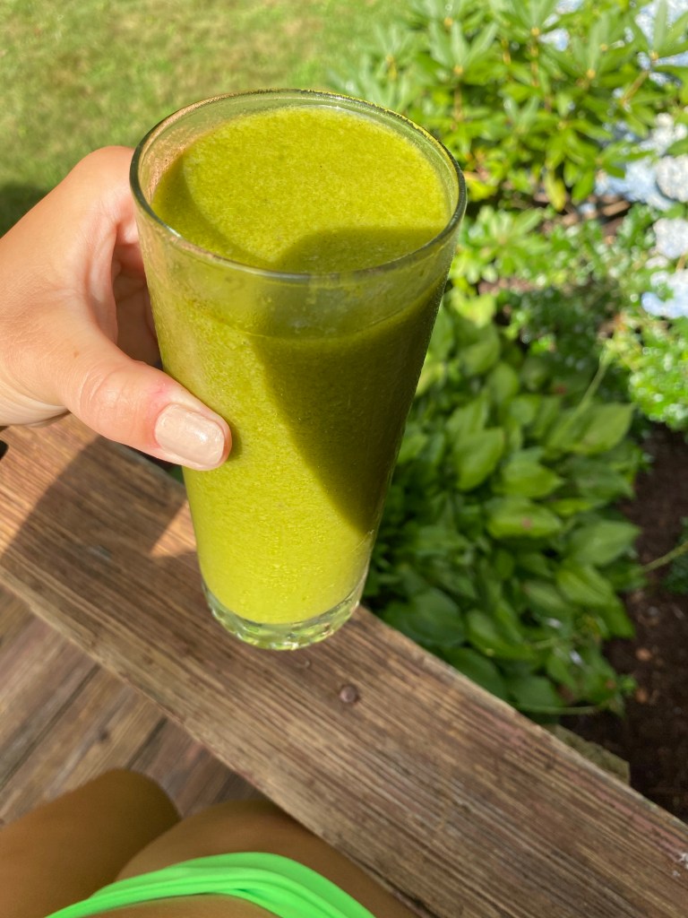 This smoothie I made has: 1.5 cup spinach, 1-1.5 cup water, 1 cup papaya, and 1 banana. This is so refreshing in the morning and a great way to get some greens in.