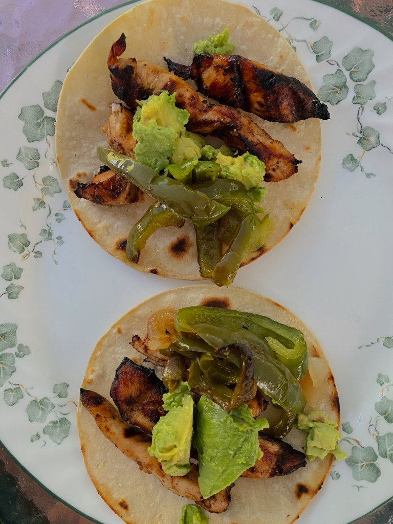 I grilled some chicken, used whole wheat tortillas, and sautéed some peppers and onions. I put some avocado on top too.