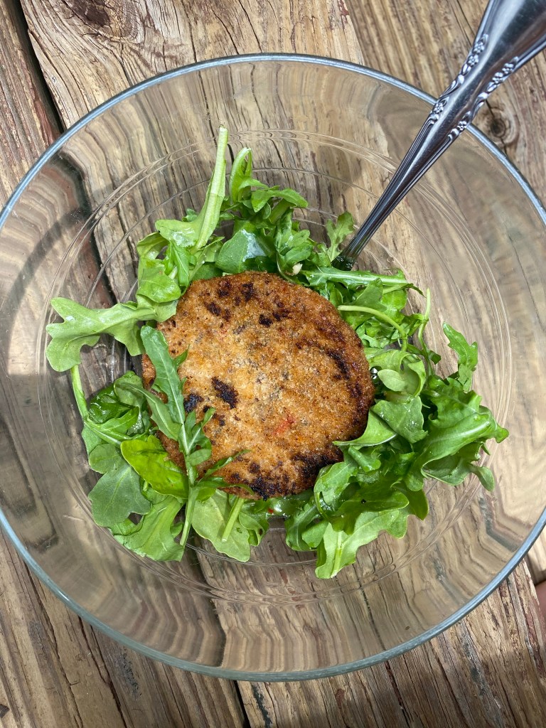This is a very simple lunch. I cooked a veggie burger and put it over a bed of arugula. I made some salad dressing with olive oil, white vinegar, lemon, garlic, and a sprinkle of salt and pepper.