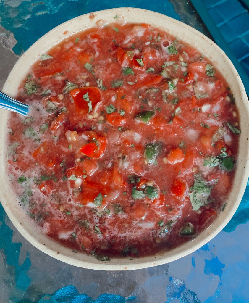 This recipe uses clean ingredients and tastes so good- even better than a restaurant! I even used tomatoes fresh from my gardens. The ingredients I used were: tomatoes, onion, garlic, limes, jalapeño (if you want), cilantro, cumin, sugar, and salt.