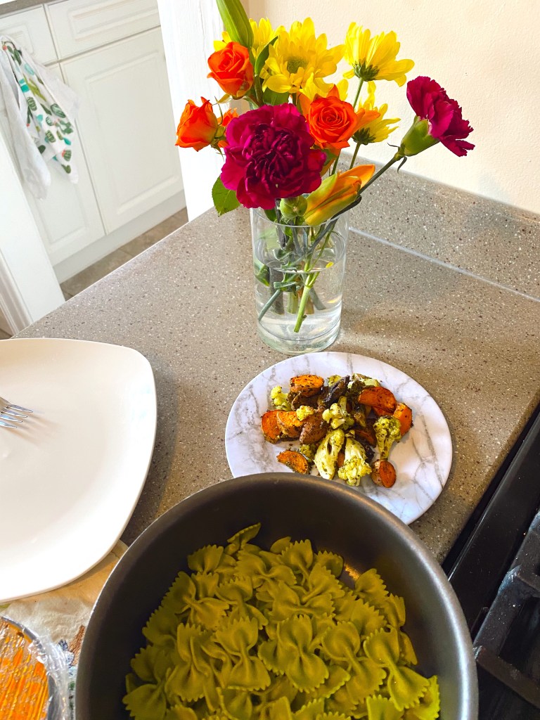 Pasta w Roasted Veggies Drizzled in Pesto Sauce